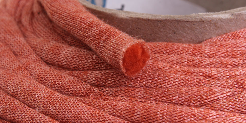 Tubular structured yarn made from a Cotton knitted cylinder filled with Nylon fibres.